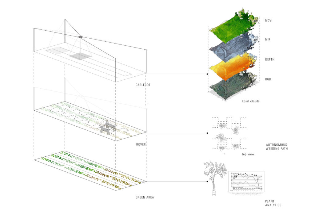 Data processing is developed through a specific customized method, generating one single point cloud, storing RGB, NDVI and Thermal Data over the same geometrical organization. This serves as a base to store the additional layers like the typology of plant, the health status, and the growth rate.